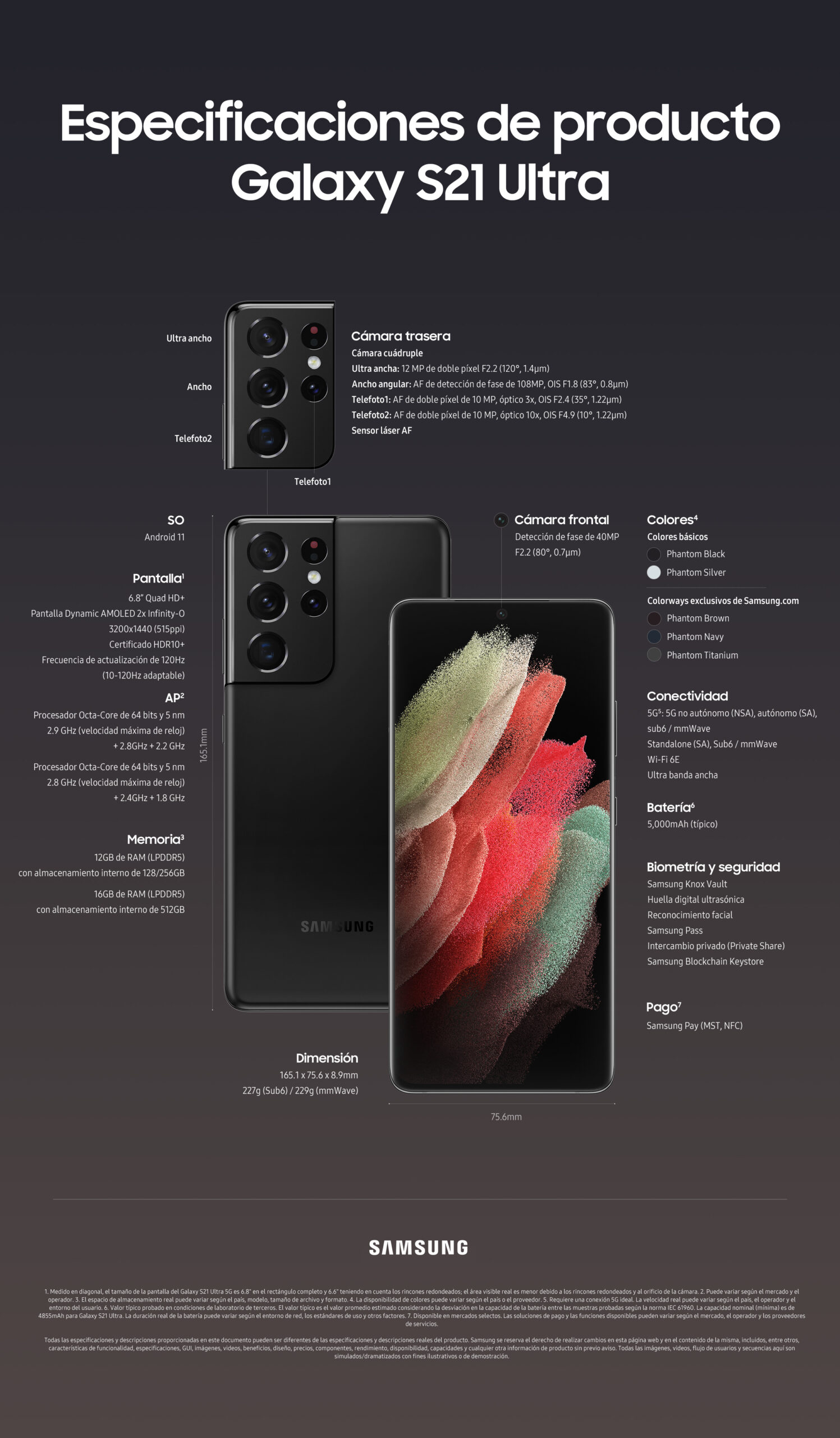 Equipado con potente IA, la cámara profesional más avanzada de Samsung e impresionante pantalla adaptable con soporte para 10Hz a 120Hz de calidad Quad HD+, el Galaxy S21 Ultra es la mejor definición de un teléfono inteligente premium que puede hacer épico su día a día.