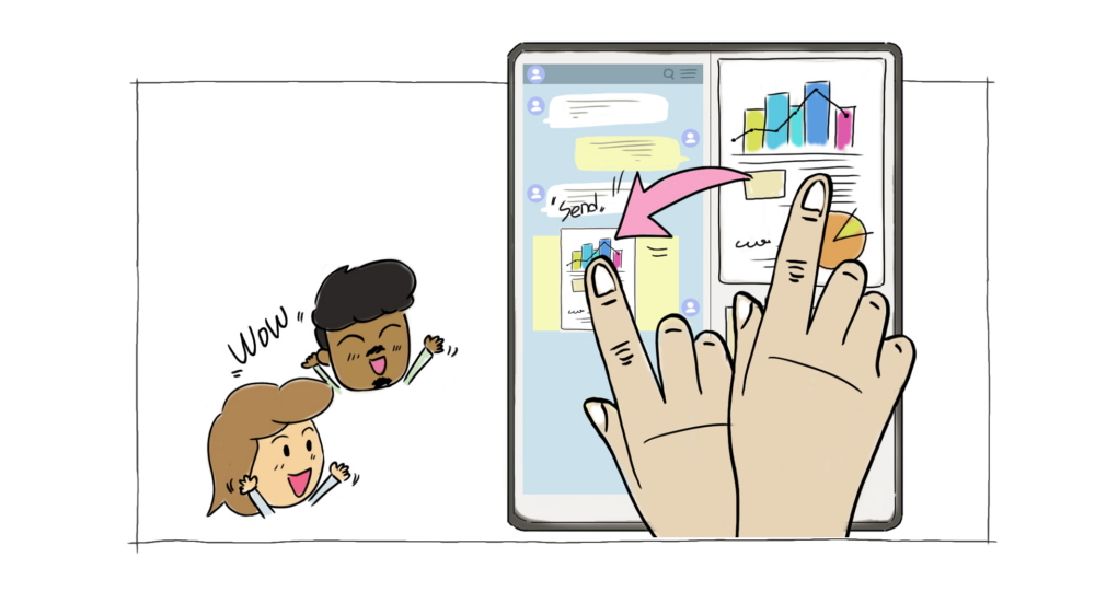 Drag and Drop (Arrastrar y soltar) es una función que te permite copiar & pegar texto, gráficos e imágenes al instante cuando usas aplicaciones compatibles. Por ejemplo, digamos que has dividido tu pantalla en tres partes usando Multi-Active Window para abrir Excel, PowerPoint y Word al mismo tiempo. Puedes editar fácilmente todos tus archivos de una sola vez con esta función, porque podrás copias datos de Excel y pegarlos de inmediato en tu presentación de PowerPoint, o copiar una imagen de PowerPoint y pegarla directamente en tu documento de Word. Desde la edición hasta el envío del archivo editado, todo puedes realizarlo directamente desde tu teléfono inteligente.
